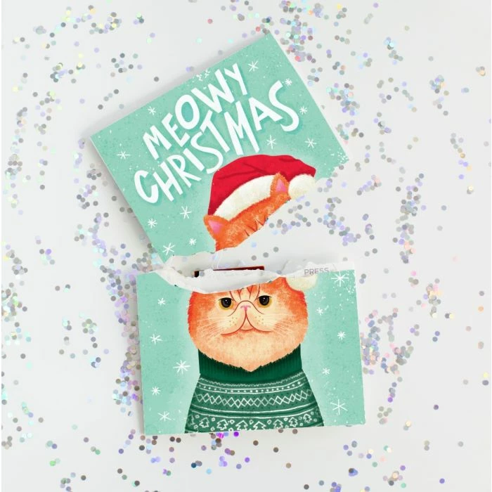 Tous les félinophiles le savent : quand les chats se mettent à miauler sans fin (pourvu qu’ils n’aient rien de grave), ils ne veulent généralement qu’une seule chose : mettre vos nerfs à l’épreuve. Et le chaton de notre carte de Noël « Miaooou » sans fin y parvient à merveille. Car dès que vous avez retiré la languette de cette carte, un chat invisible entonne joyeusement un chant de Noël sous forme de miaulements, qui ne sont que bien trop audibles, bien trop discordants, et surtout : bien trop longs, car ce chat ne s’arrête jamais – du moins jusqu’à ce que la pile rende l’âme. Et cela dure un moment. Peut-être pas jusqu’à la nuit des temps, mais un bon moment.